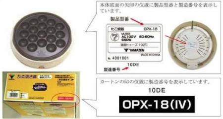 弊社製「たこ焼き器」(下記機種)におきまして、一部電源コード接続部にネジの緩いものが混入し、使用中に発煙、発火に至る危険性があることが判明しております。つきましては、事故防止のため無料で修理・改良品交換の処置をさせていただきたく存じます。