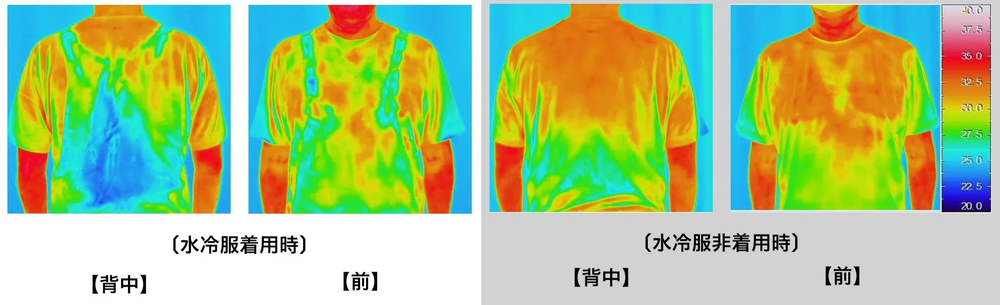 水冷服を着用して踏み台昇降運動を実施したところ、水冷服着用時には上半身全体に冷却効果が見られました。