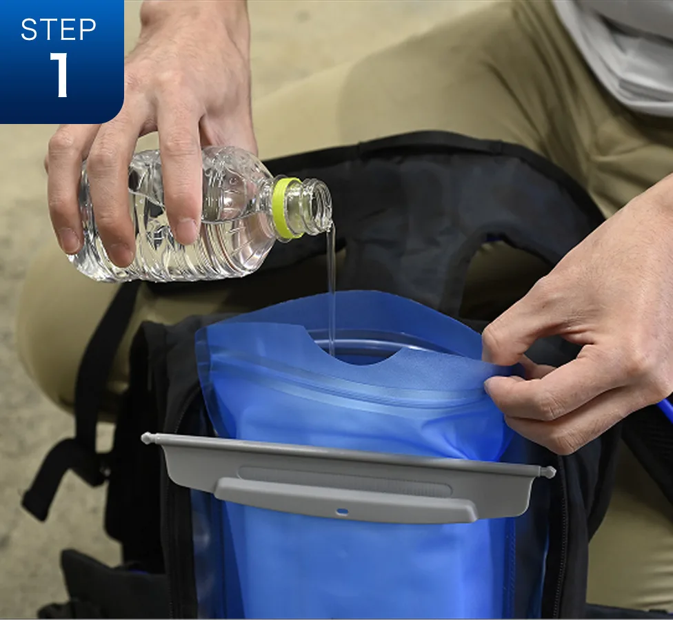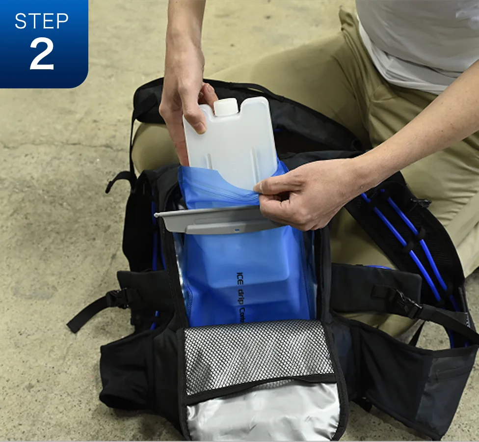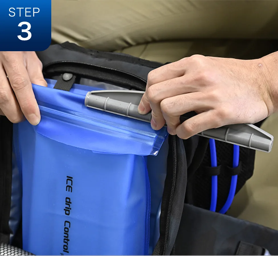 タンクポケットを開け、スライドクリップ部を取り出し、凍った専用チャージボトルを入れる。