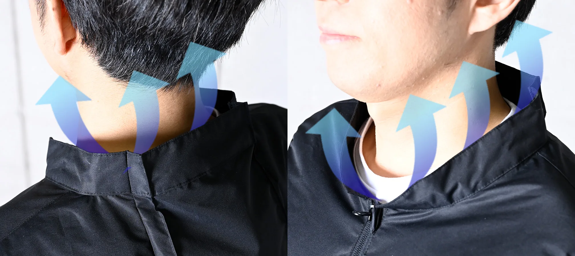 パワフルなファンが風を巻き起こすことで、背中から首へ風が抜けます。