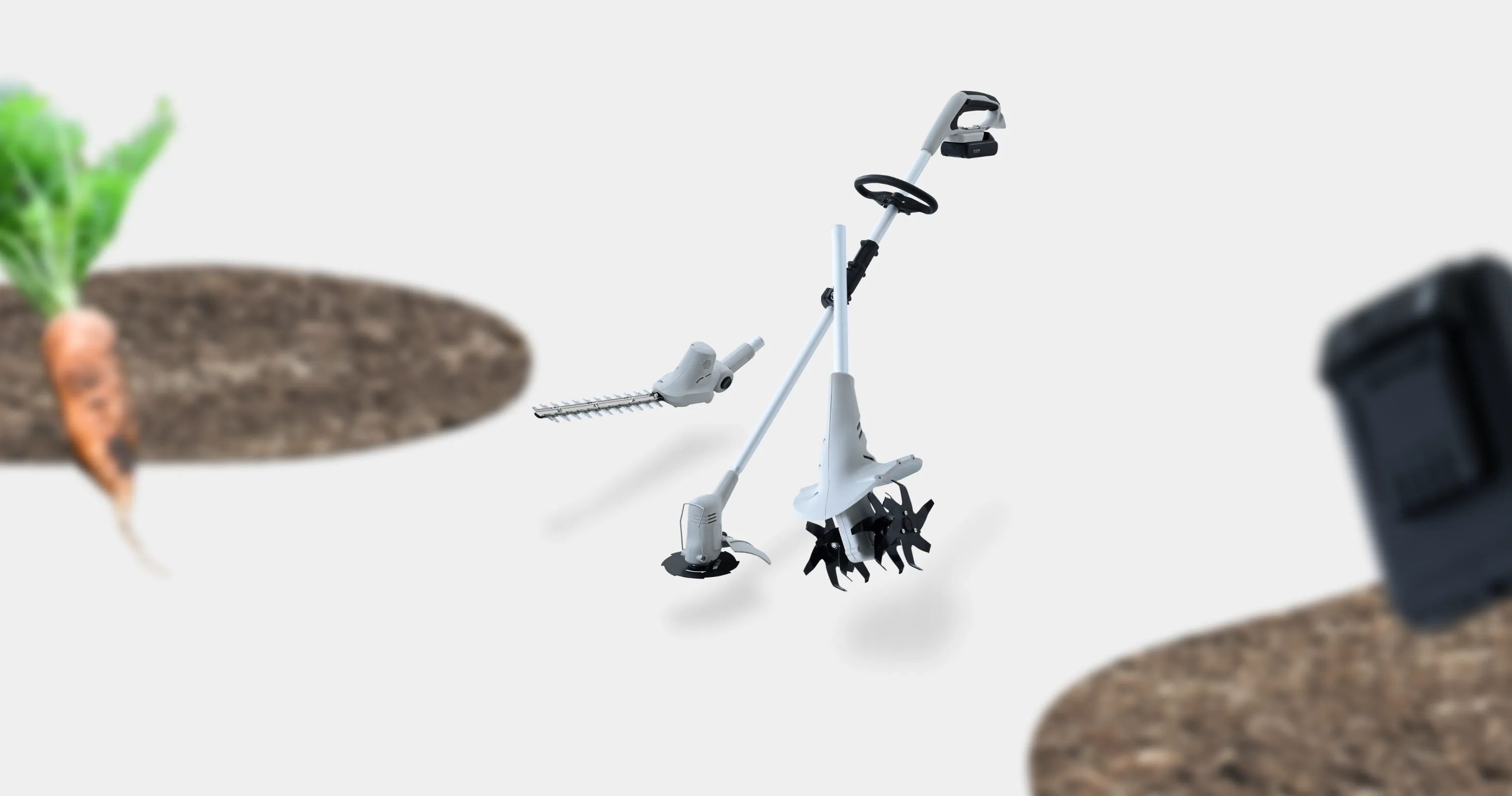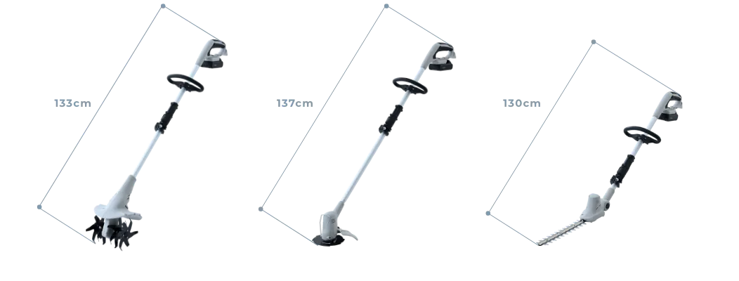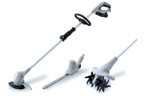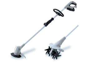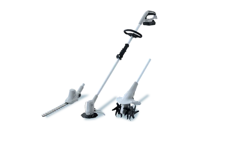 用途に合わせて先端アタッチメントを付け替えるだけで、耕うんや草刈りなど庭のさまざまな作業に対応。