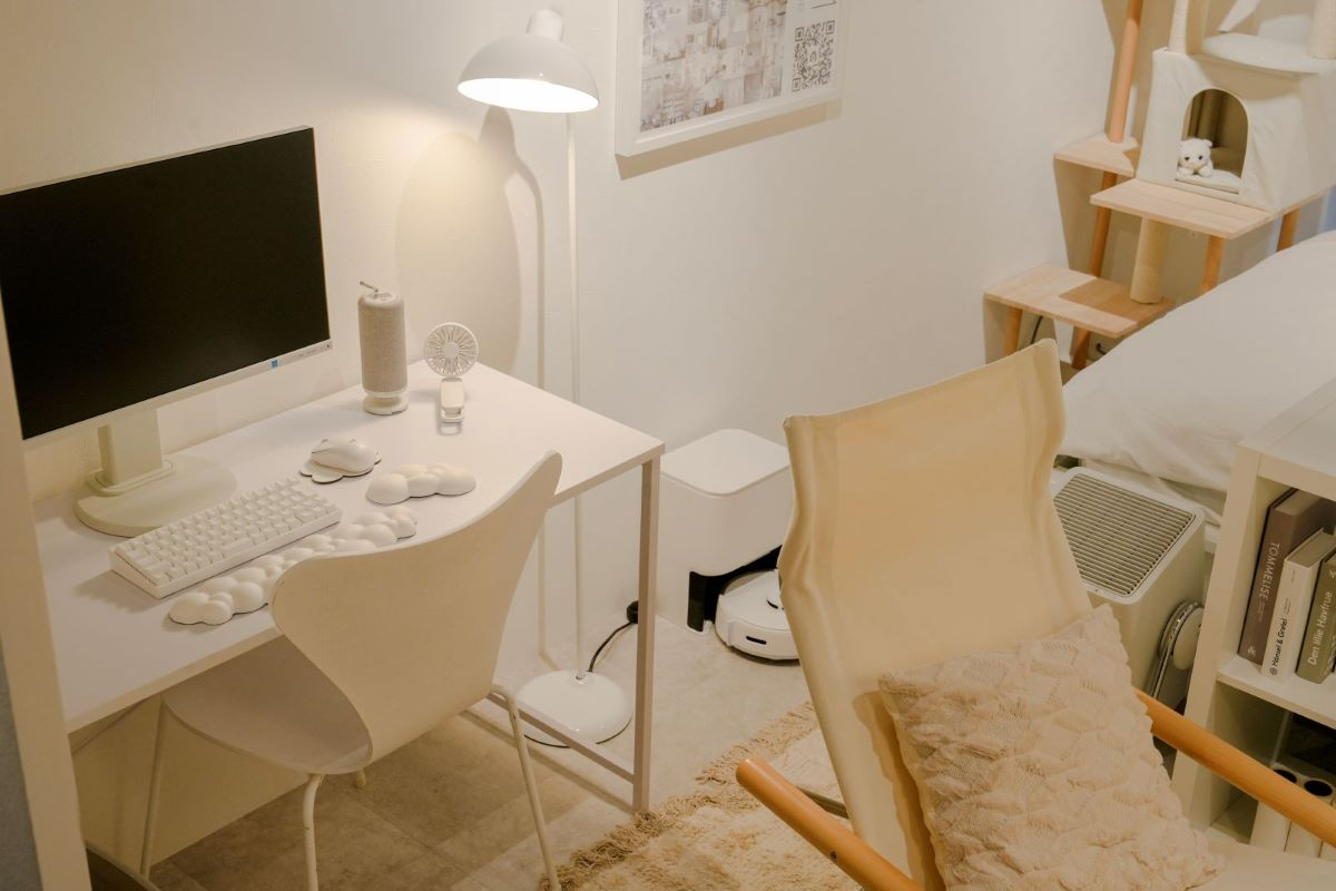 画面左端のデスクが、山善の「コンセント付きシンプルワークデスク」です。