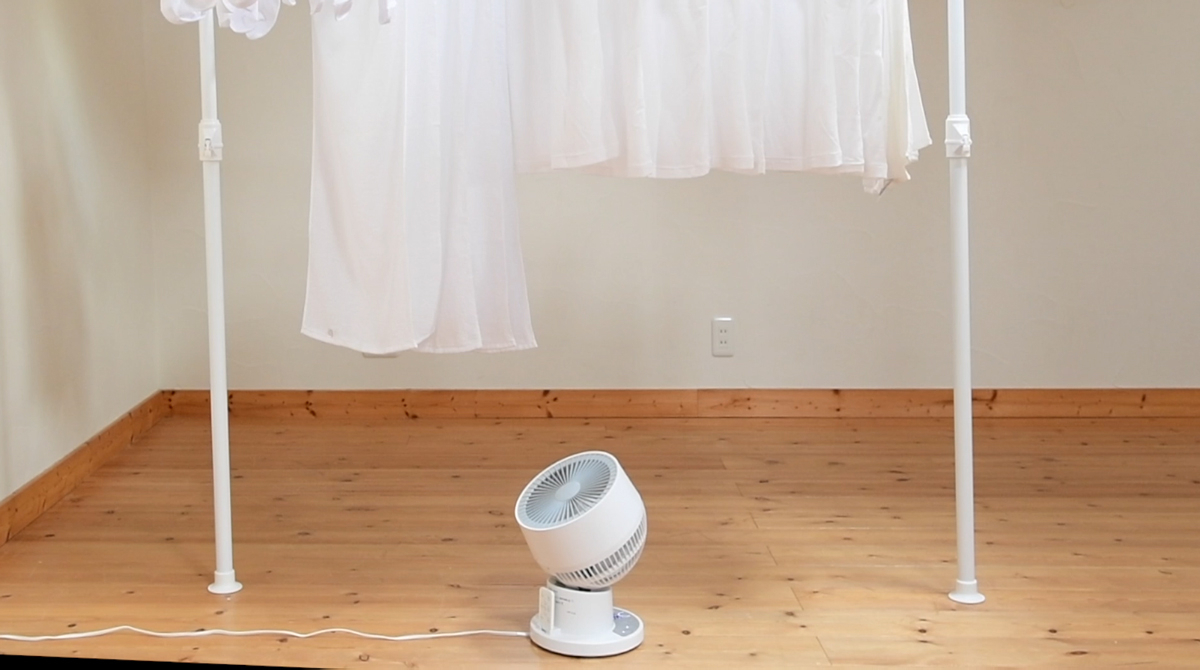 真上をセンターとして前後に70°自動首振り出来るので、洗濯物の真下から効率的に送風できます。洗濯物の部屋干し乾燥にも最適です。