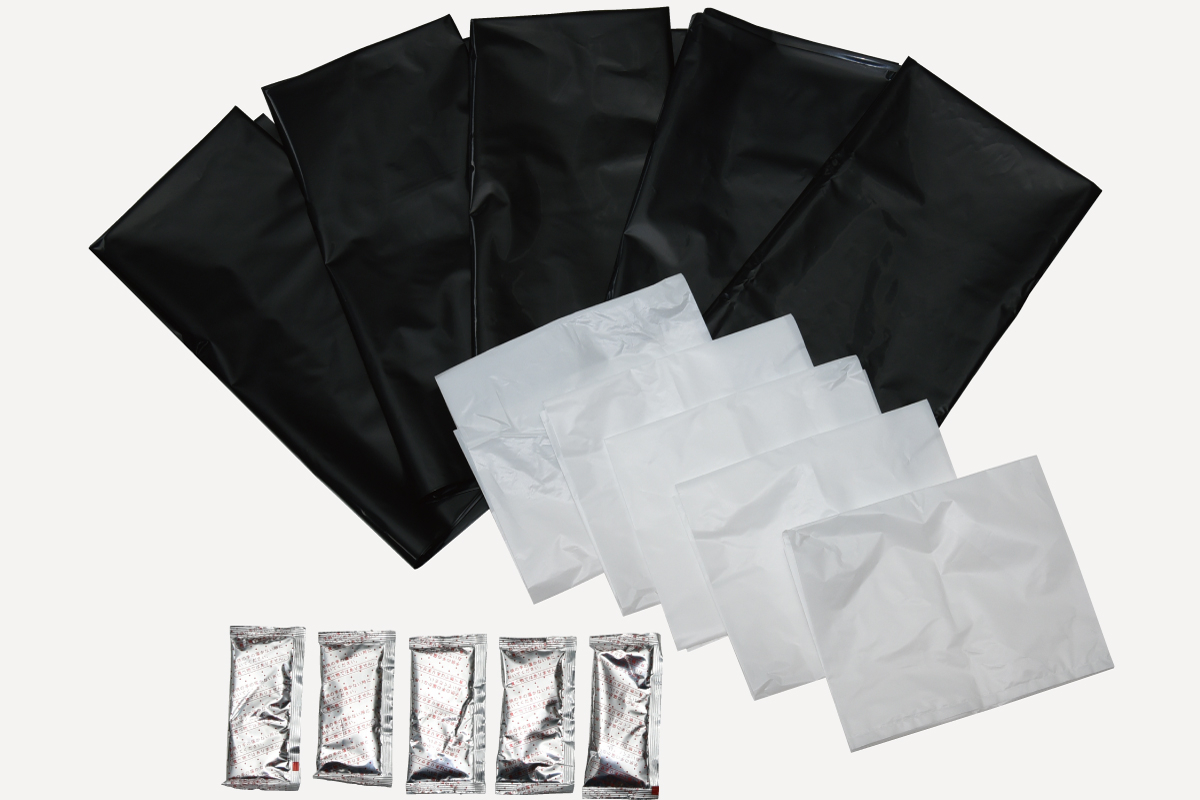 「汚物袋」「処理袋」「凝固剤」のセット。厚めの汚物袋なので漏れにくいです。処理袋付きだからどこでも安心です。