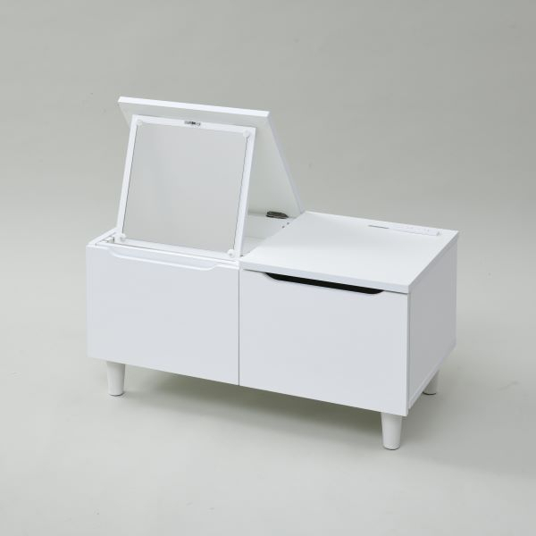| 仕様 | ●普段はテーブル、その場でメイクできるドレッサー ●本体は完成品、脚を取り付けるだけの簡単設置 ●天板を上げると正方形の鏡が登場、角度を3段階で調整も可能 ●テーブルの下は引き出し収納、中が見渡せて、金属レール付きで出し入れも楽々 ●そのままドライヤーを使ったり携帯も充電できる、2口コンセント付き ●背中側もすっきりな背面化粧仕上げなので、センターテーブルとしても活躍 ●鏡サイズ:たて27.5 よこ27.5cm ●引出し内寸:幅29 奥行27.5 深さ13(側板)/22(有効)cm ●テーブル下すき間:幅60.5 高さ10cm ●天板サイズ:左37・右37 奥行39.5cm ●耐荷重:天板20、引き出し3kg ●2口コンセント付き(計1500Wまで)、コード長さ1.4m |