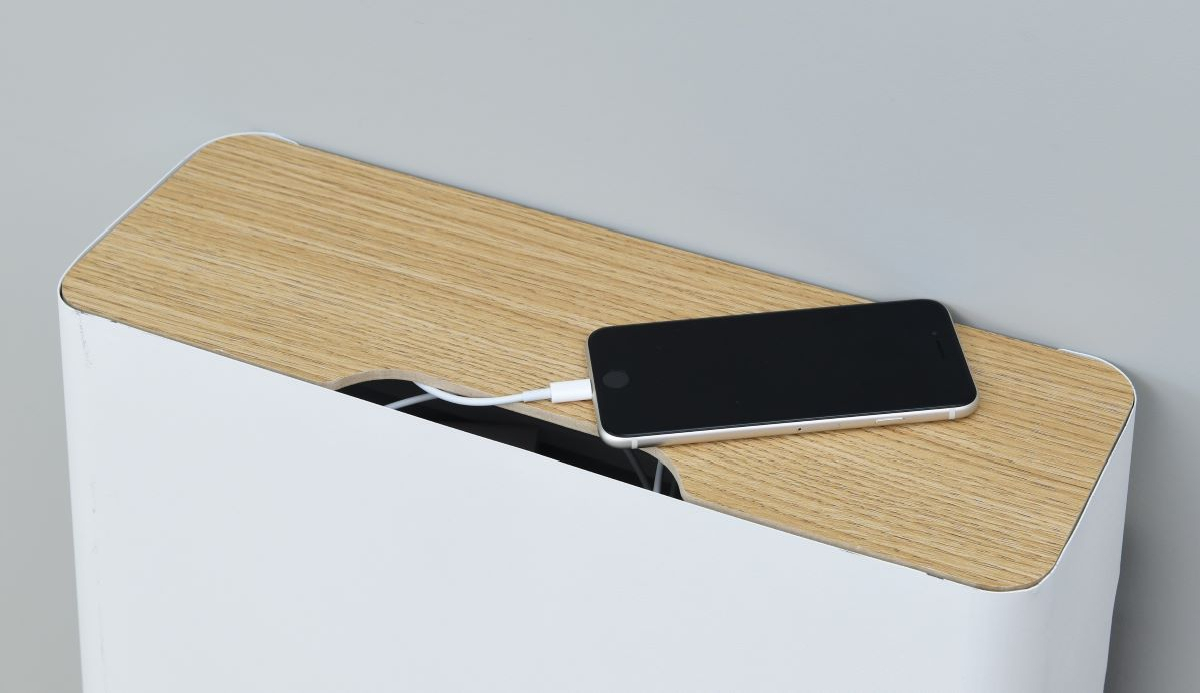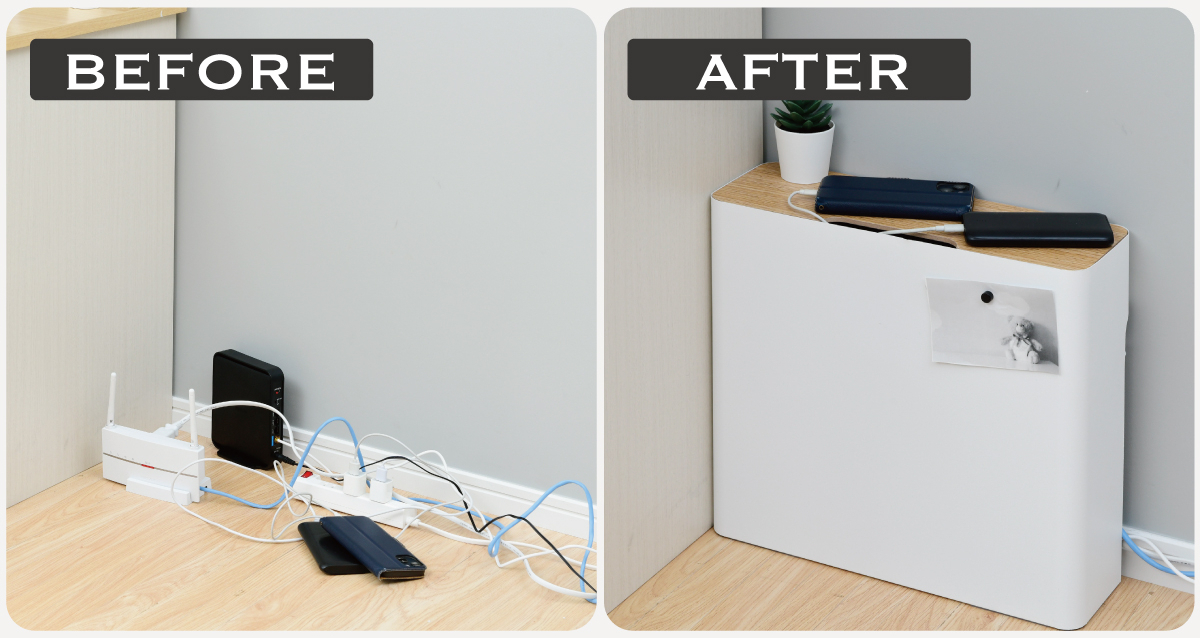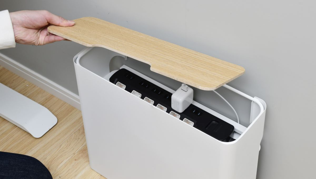ケーブルをすっきりできる、コード収納ボックス。スリット入りの天板で、ケーブルを出して充電できます。