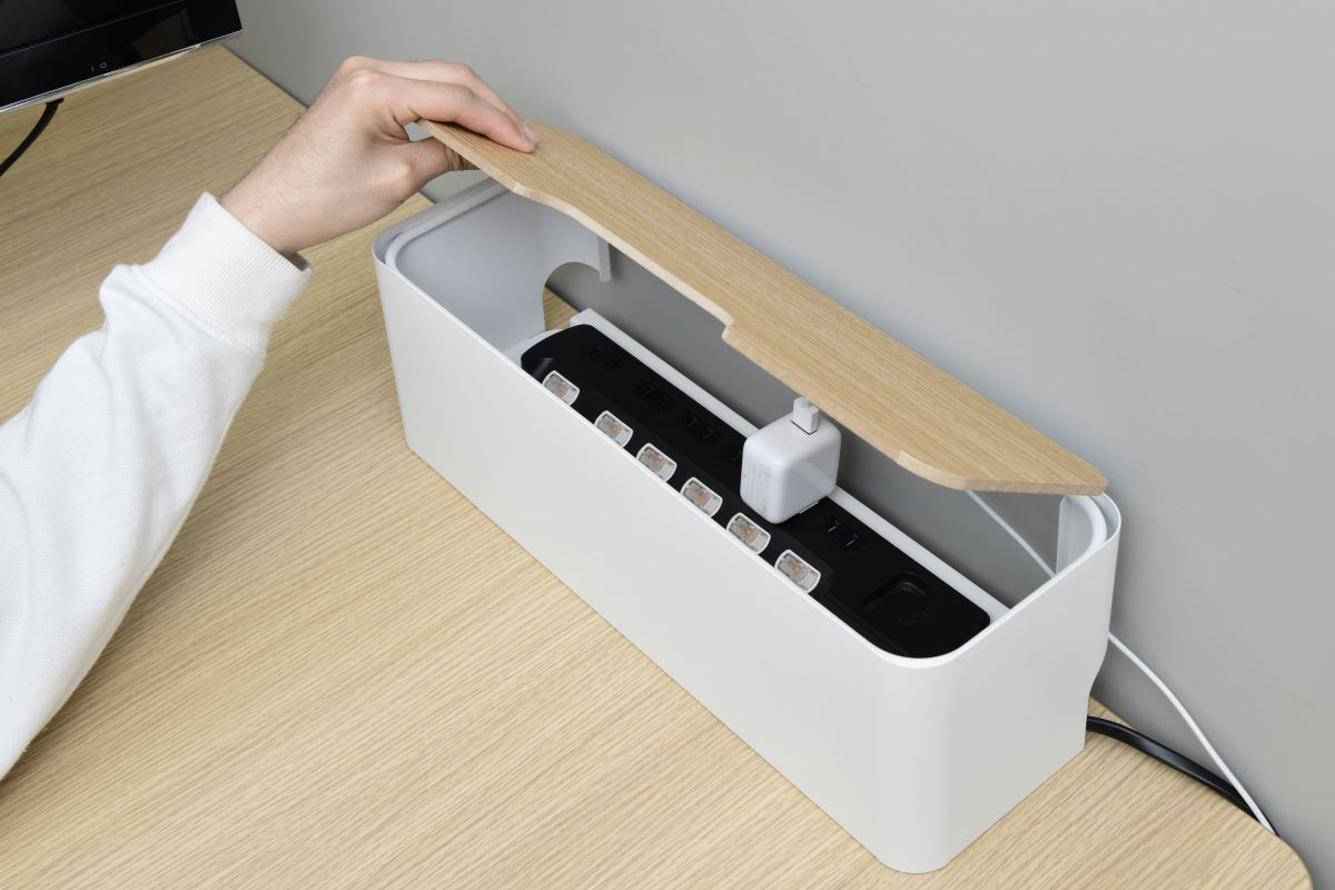 机の上のケーブルをすっきりできる、コード収納ボックス。スリット入りの天板で、ケーブルを出して充電できます。