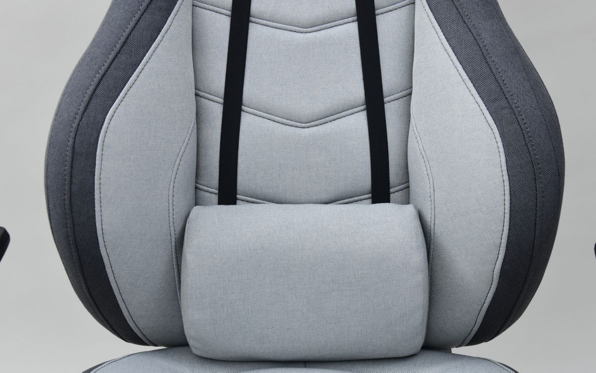 無段階リクライニング&腰当て用クッションも付属したゲーミングチェア。座面は両サイド・中央で高さが異なり、臀部をすっぽり包み込む形状です。