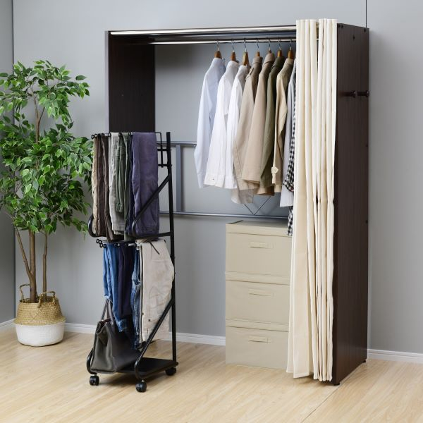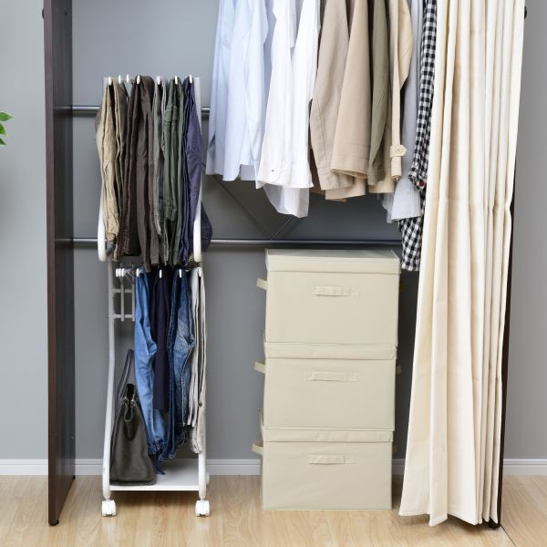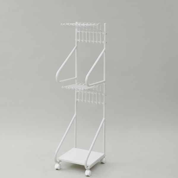 | 仕様 | ●クローゼットの中で、パンツをたたまず収納できるハンガーラック ●上下2段で14本のパンツを収納 ●バーはスイング式、着脱もできて出し入れラクラク ●滑り止めのシリコンキャップ付きなのでストレス緩和 ●フレームはしっかり構造、端部はハンドルのようにつかむことも可能 ●脚部間内寸:脚部間内寸:幅25cm ●ハンガーバー内寸長さ:24.5cm ●ハンガーバー高さ:上51.5・下64.5cm ●全体耐荷重12kg(1本あたり0.6kg) ●棚板サイズ:幅25 奥行30cm ●棚板耐荷重:5kg ●棚下のすきま高さ:7cm ●キャスター4個(うちストッパー付き2個) |