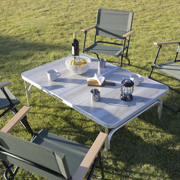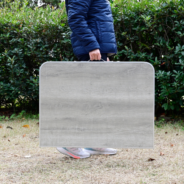 サビに強く軽量なアルミフレームを採用した折りたたみテーブル。ヴィンテージ感あるホワイトウッド調天板。