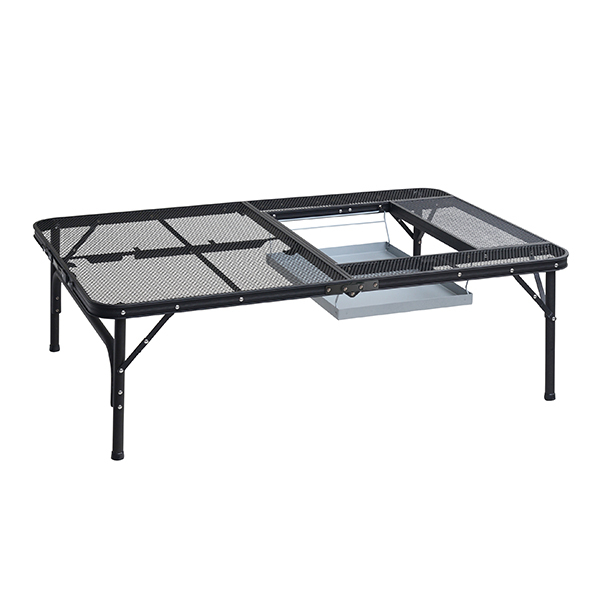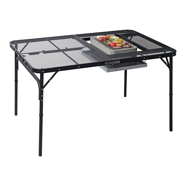 | 仕様 | ●水や熱に強い次世代のタフなテーブル ●天板は手入れしやすい金属製メッシュ棚でダッチオーブンやバーベキューコンロをそのままのせられます ●軽量で移動時や収納時作業も簡単 ●BBQコンロ設置可能サイズ:50×34cm ●天板総耐荷重:40kg |