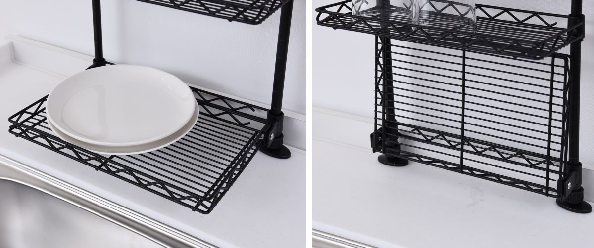 | 仕様 | ●設置場所が柔軟な、突っ張り固定式キッチンラック ●棚板を調節できる、スチールラックタイプの棚板4段式 ●最下段は、使わない時はたたんでスペースを広く使える跳ね上げ式 ●棚は全段、こぼれ止め仕様(約1.5cm) ●棚板は「カチオン電着塗装」の下処理がされ、水に強い加工 ●左右付け替え可能なふきんハンガー、高さも調節可能 ●耐荷重:棚(小) 2kg、棚(中) 3kg、棚(大)4kg、ふきんハンガー(1本)100g、全体10kg ●棚(小):29×9cm ●棚(中・2段):29×14cm ●棚(大):26.5×17.5cm ●3連ふきんハンガー:約19cm ●2017年2月1日より、リニューアルモデルでの販売となります。 棚板が1段追加、棚にこぼれ止めが追加、塗装が粉体塗装 |