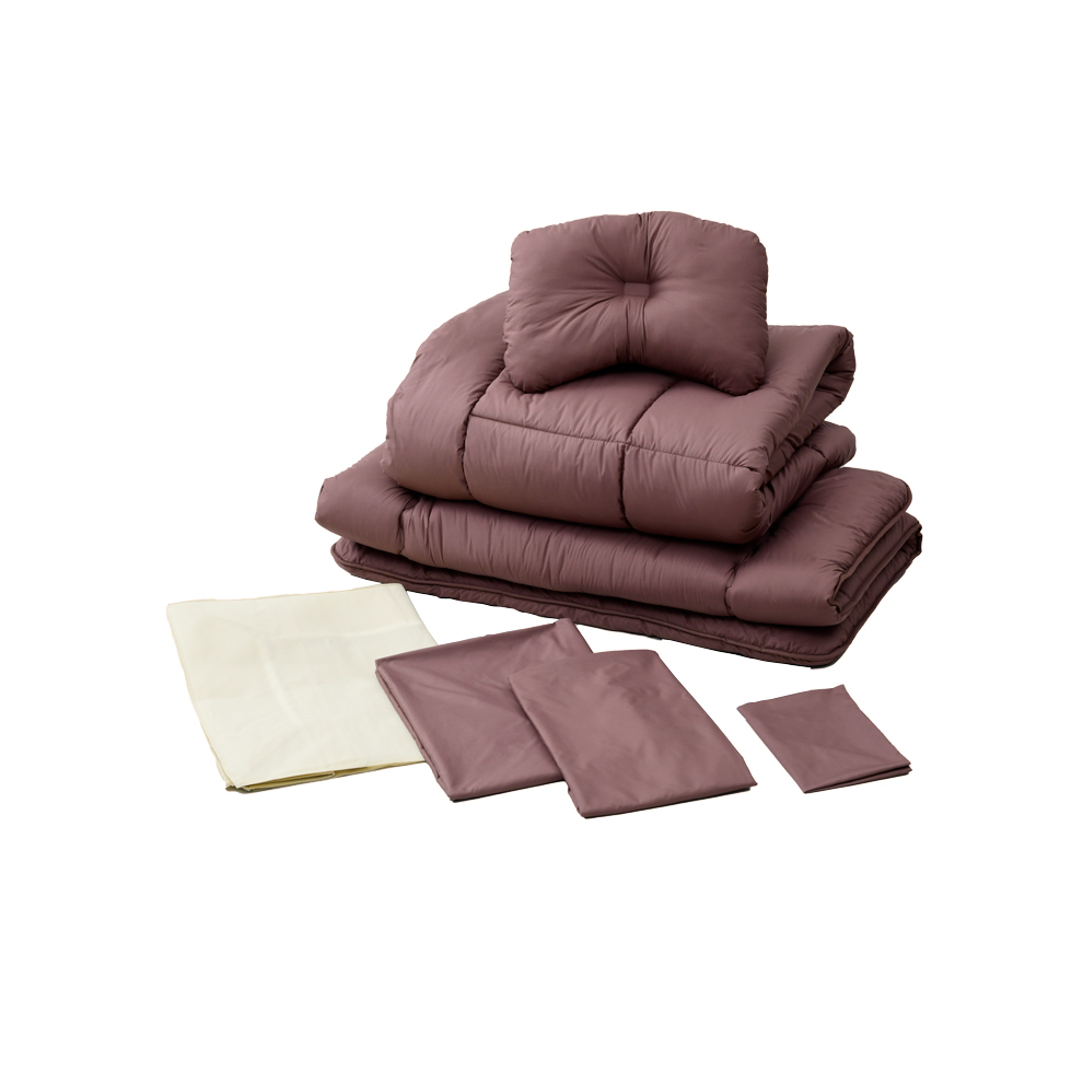 ●掛け布団 側地:ポリエステル100% 詰め物:ポリエステル100% 充填量:1.7kg ●敷布団 側地:ポリエステル100% 詰め物:ポリエステル100% 充填量:巻き綿1.65kg+固綿1.65kg ●枕 側地:ポリエステル100% 詰め物:ポリエステル100% 充填量:0.5kg ●掛け布団カバー、敷布団カバー、枕カバー 側地:ポリエステル100% ●収納ケース 不織布+PVC |