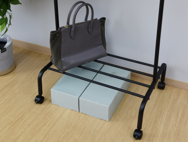 足元はすのこ状のパイプ棚で、バッグなどを置くのに最適です。