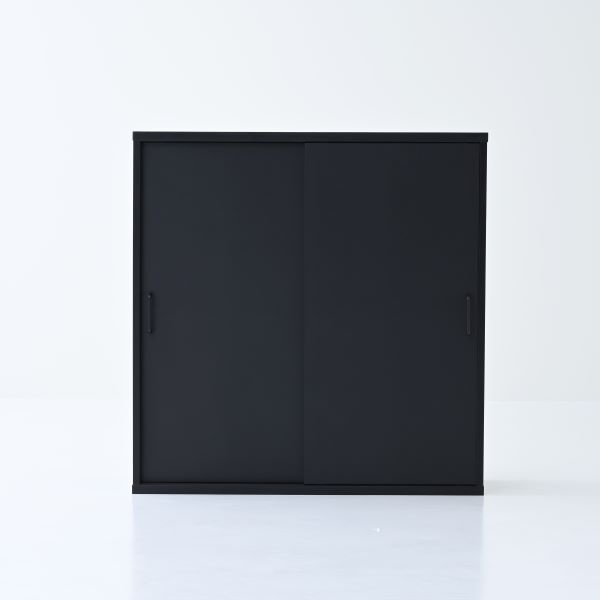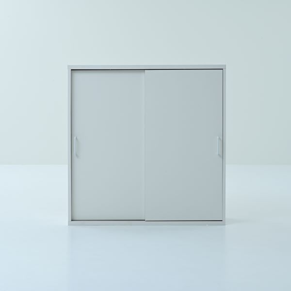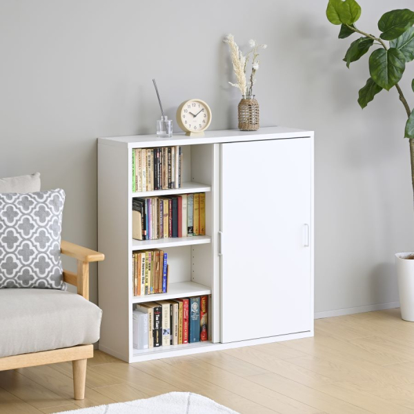 中が隠せる扉付きの本棚です。場所を取らない引き戸タイプ。