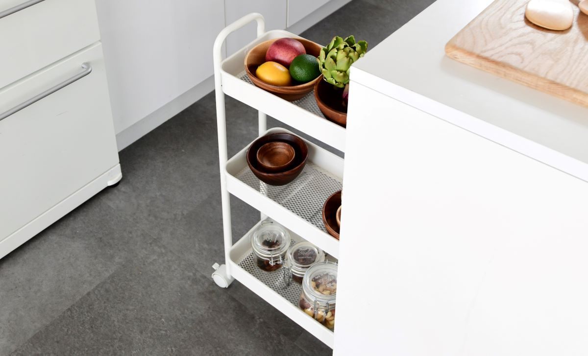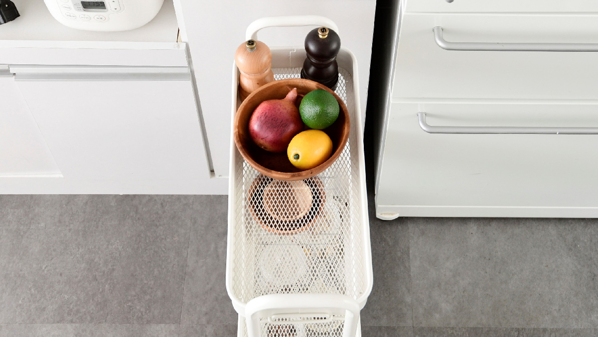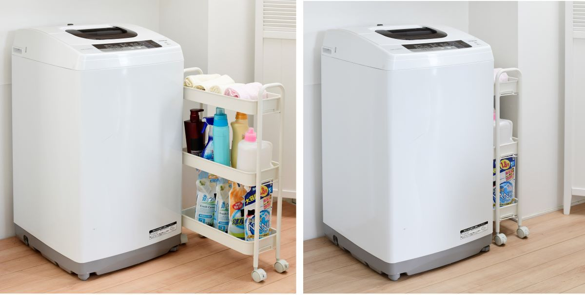 幅18.5cmのスリムタイプなので、洗濯機と洗面台の間など、すき間収納に最適です。