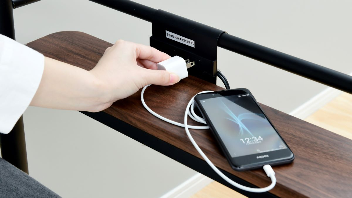便利な2口コンセント付き♪ 宮棚の位置は左右どちらにも取り付け可能で、スマホや本などを置くのに充分なスペースです。
