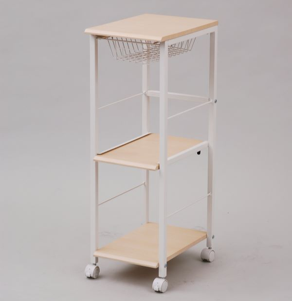 天板の下には引き出し式のカゴ付き★真ん中の棚は約10cm手前に引き出せるので、蒸気の出る炊飯器等の置き場に最適です。下段は2リットルのペットボトルを入れるのにピッタリの高さです。