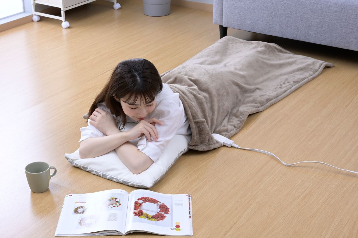 イスに座って、床に寝そべって、スッポリ★中綿入りでおしりも背中もふっくら暖かな電気毛布です。
