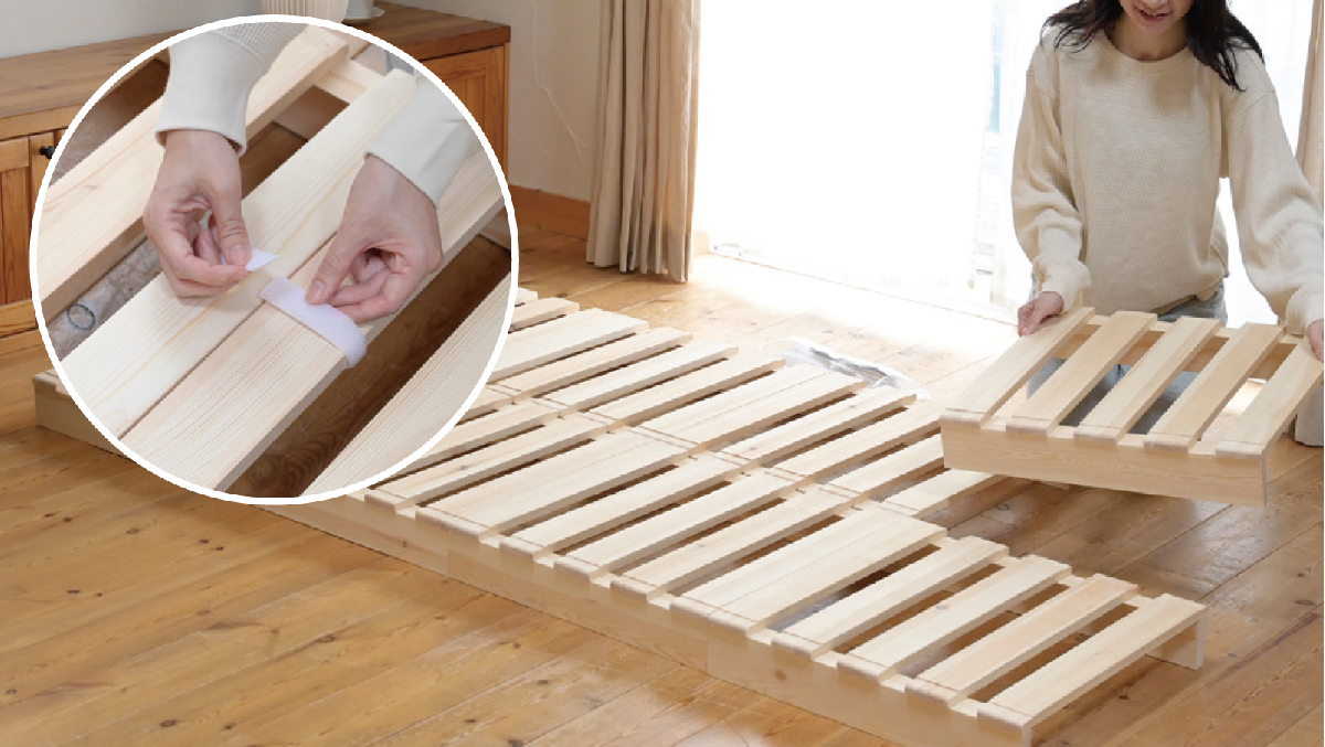| 仕様 | ●低いベッドをお探しの方へおすすめなロータイプベッドフレーム ●パレットのように組み合わせて使う、木製すのこのローベッド ●バラバラにしても並べるだけなので、模様替えや引越しに嬉しい完成品 ●素材はパイン材、燻蒸処理をして、死に節を除外する選定基準で安全に配慮した設計(無塗装) ※研磨や面取り処理は行っていますが、ザラつきが残る場合があります ●角度は丸みをつけたやさしいデザイン ●すのこ1枚あたり約2kg ●床への接地面はすべて脚にフェルト貼り付け ●8枚でおよそシングルサイズ、1枚ずつは付属のバンドでしっかり連結することも可能 ●さらに追加すると、ダブルサイズにできたりハイタイプにできたり、使い方のアレンジ可能 ●静止耐荷重は、 8枚をシングルベッド利用時で200kg 12枚をダブルベッド利用時で300kg (耐荷重は、保証値ではございません。) 本製品は最大荷重試験の7000N(約700kg)をクリアした商品です。 当社では安全を考慮し、本商品はシングルベッド利用時は耐荷重200kg、ダブルベッド利用時は耐荷重300kgに設定しております。 ●しっかりしたつくりなので、組み合わせを変えてベンチのように使うことも可能 ●パレット1枚あたりサイズ: 幅49cm 奥行49cm 高さ9cm、重量1.8kg ●すのこ板が5枚、すのこ板厚み1.5cm、すのこ隙間約4cm ●連結用バンド(面テープ) 10本付属 ※2023年12月1日より耐荷重表記について見直しを行いました。 |