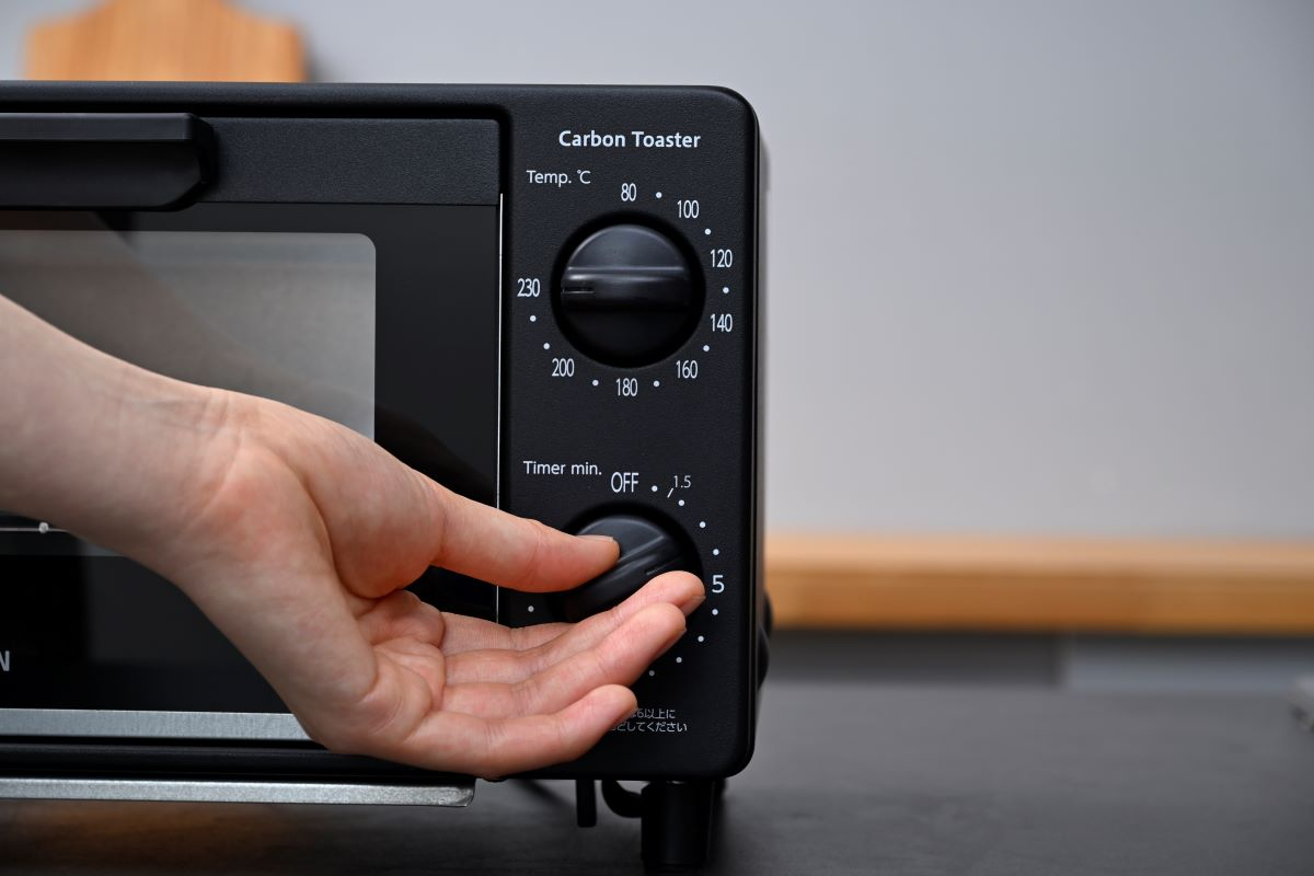 つまみを回すだけのシンプル操作。温度設定は80~230℃まで16段階で調節できます。タイマーは最大15分まで。