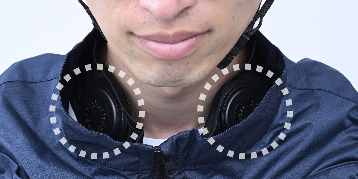 ウェアの内側にペルチェプレートを取り付けて、首元を直接冷やします。冷却ペルチェプレートとファンにより、さらに涼しく感じることができます。