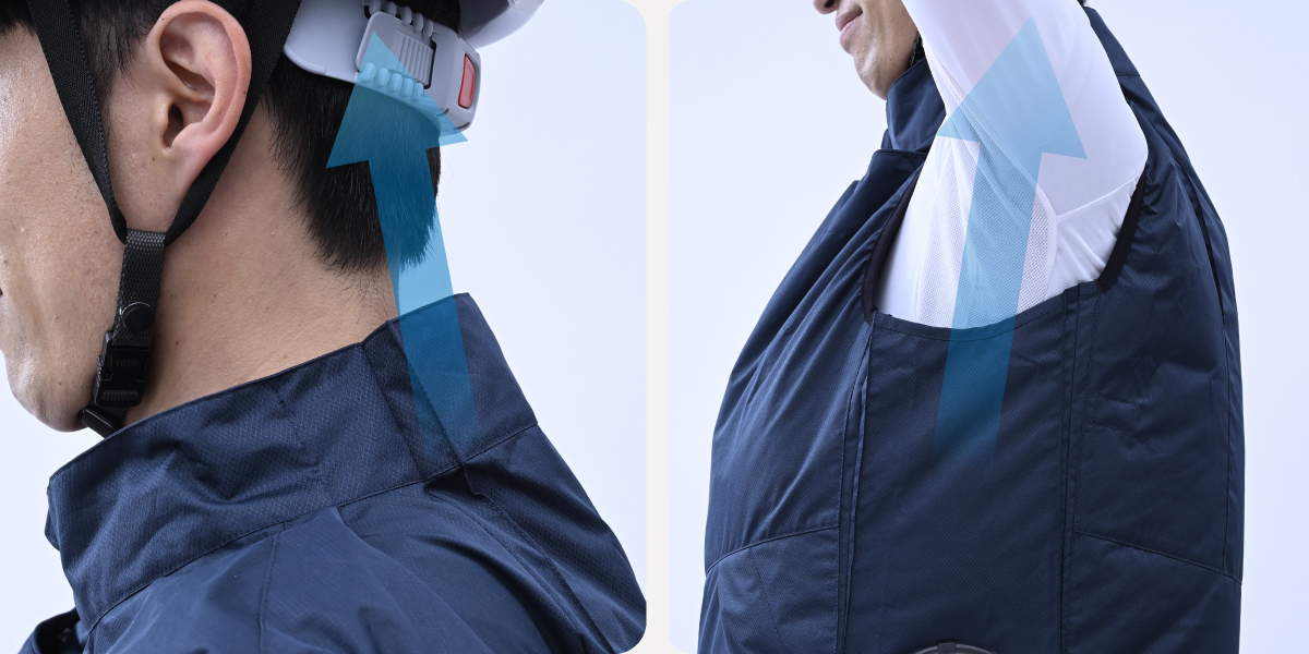 暑いときに人が冷やしたくなる、顔、後頭部、脇に風が当たるように通気口やスリットを作りました。両胸に通気口「エアベンチ」、襟の後ろにスリット「バックエアスリット」、両脇下にもスリット「脇スリット」を入れることで、風が通り抜け、風が効率よく当たります。