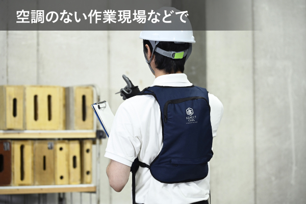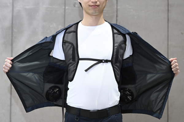 凍ったペットボトルによって冷やされた水が、水冷服に張り巡らされたチューブの中を循環することで身体を冷やします。