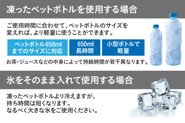 ペットボトル1本で、冷たさが約2時間から最大3時間持続します(※)。凍らせたペットボトルの他に氷も使用可能です。