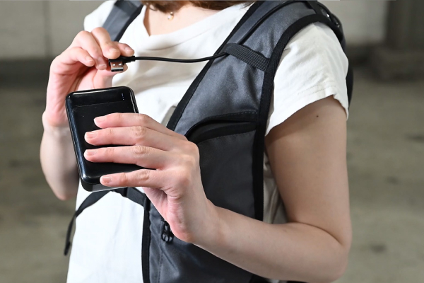 市販のモバイルバッテリーが使えるので、出先でバッテリーが切れてしまっても安心です。モバイルバッテリーは胸ポケットに収納できます。