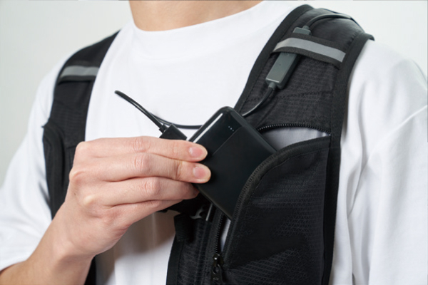 市販のモバイルバッテリーが使えるので、出先でバッテリーが切れてしまっても安心です。モバイルバッテリーは胸ポケットに収納できます。