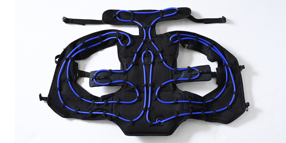 凍った専用ボトルによって冷やされた水が、水冷服に張り巡らされたチューブの中を循環することで身体を冷やします。