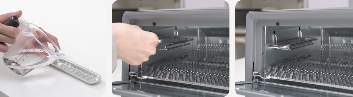 山善初のスチーム機能を搭載しています。付属のスチームカップに水を入れて設置することで、スチーム加熱を行います。