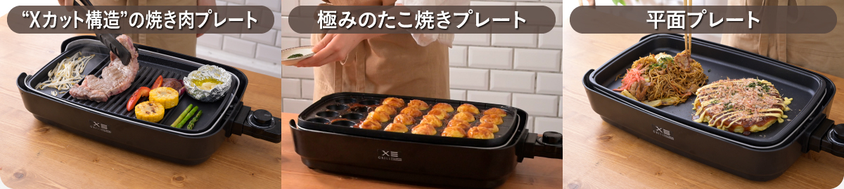 「“Xカット構造”の焼き肉」「極みのたこ焼き」「平面」の3枚プレートが付属しています。これ1台で様々な料理を手軽かつ本格的に楽しむことでき、ホームパーティーなどに活躍します。