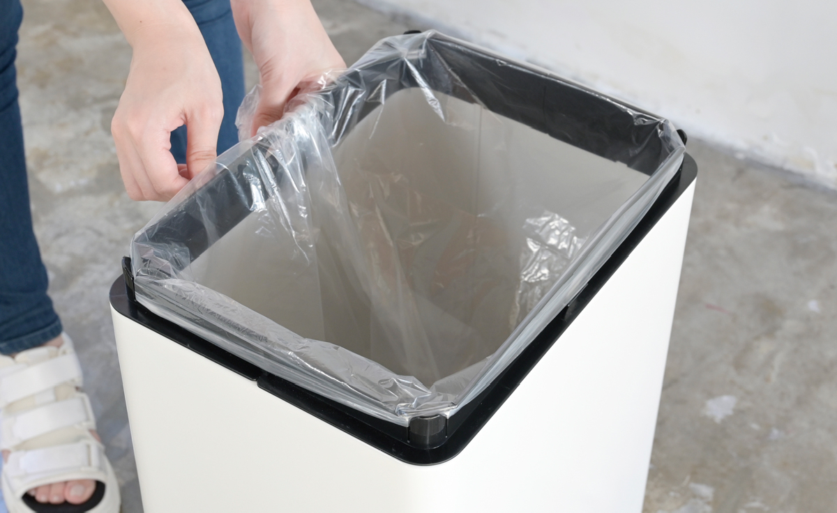 すき間の少ない被せ式の蓋なので、匂いの広がりを抑えます。ゴミ袋を留める溝が内側に付いているので、見た目もスッキリ★