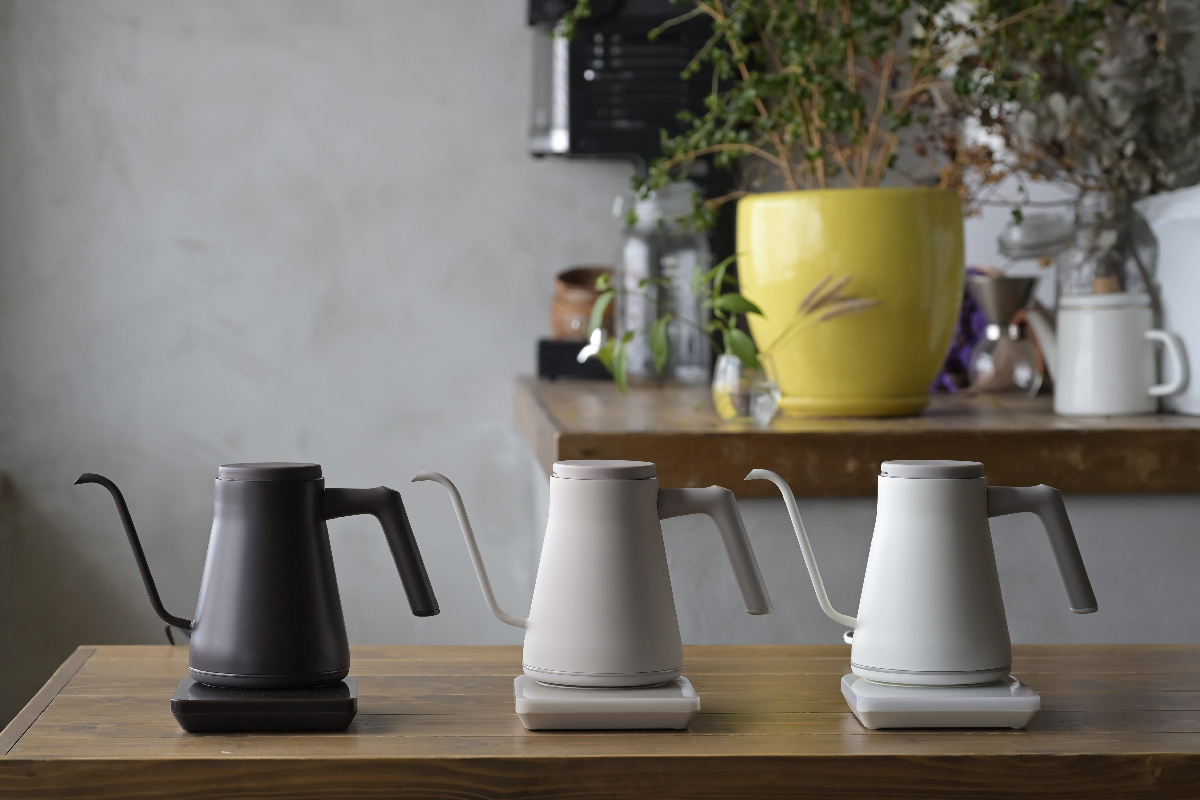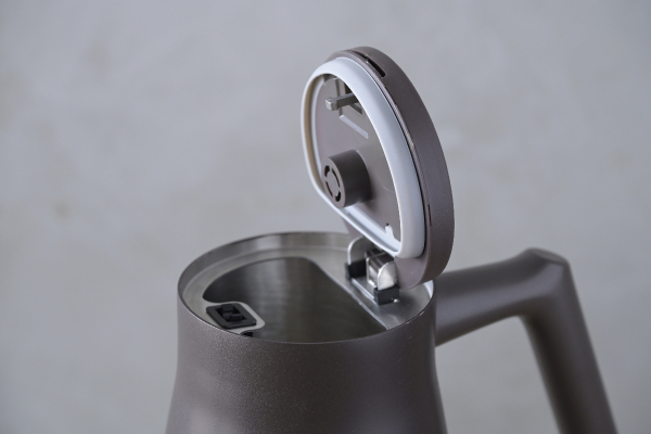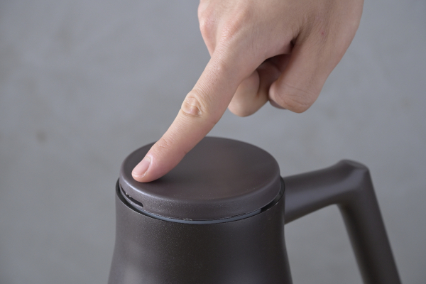 フタを開ける際の火傷のリスクにも配慮し、プッシュ式に改良しました。蓋が壁になり湯気が細口ノズル側に広がることで手に触れにくくなっています。また、取っ手が無くなりすっきりとしたフラットデザインになりました。