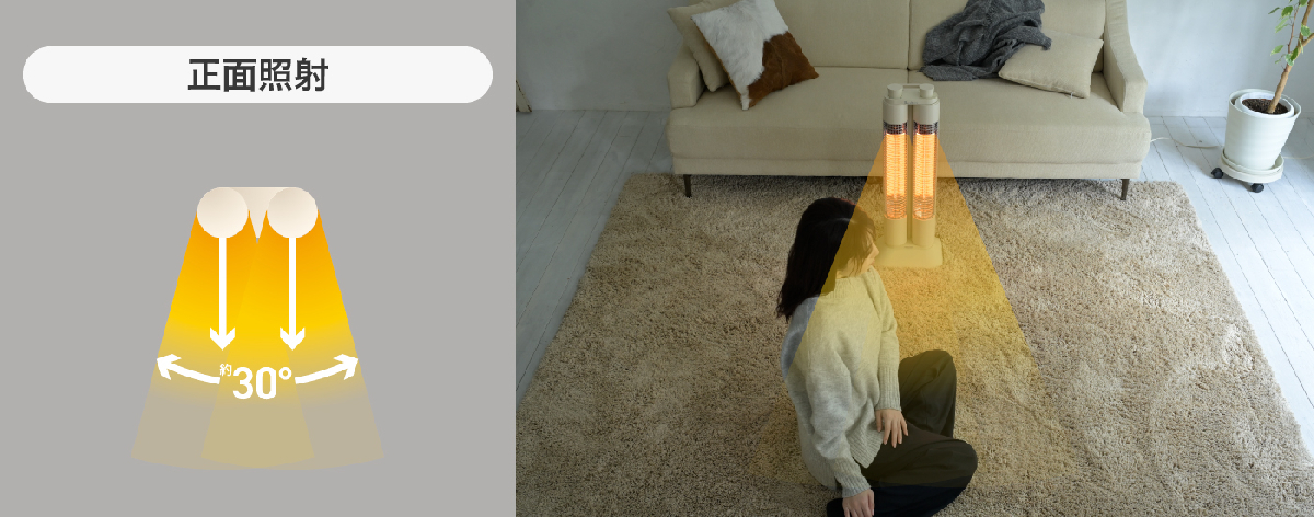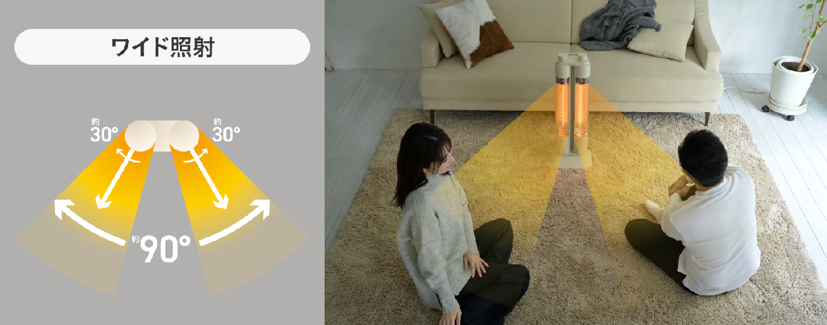 従来の首振り機能ではヒーターが向く方向しか暖かくなかったところを、複数のヒーター(筐体)を横に連ねたことで、最大約90°の広範囲を“常時”暖めます。従来品と同程度の消費電力で、広範囲を“常時”暖めることができます。