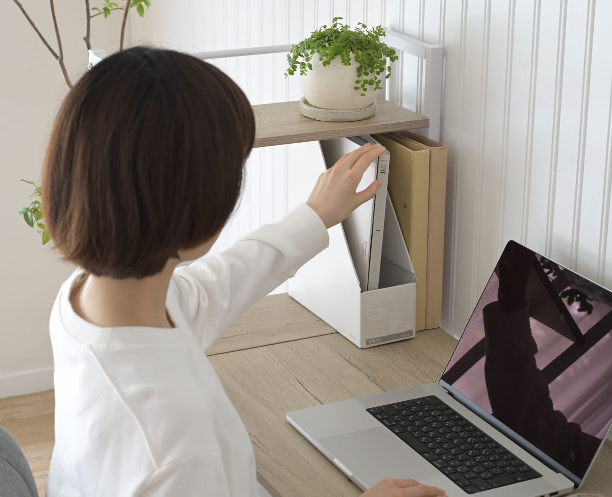 棚とデスクが一体となっているので、作業中必要な時に必要なものをサッと取り出せます。