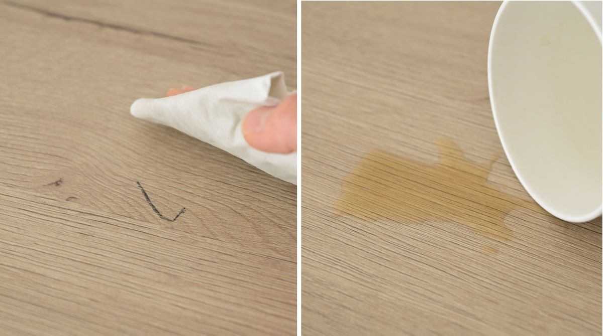 天板は傷や汚れに強い合成樹脂化粧繊維版を採用。汚れてもサッと拭くだけなので、お手入れ簡単です。