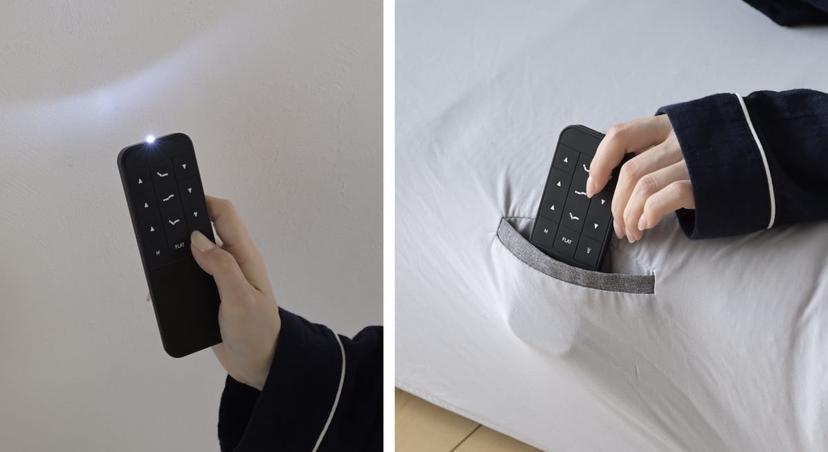 ワイヤレスリモコンなので、コードの煩わしさなくお使い頂けます。カバーの右側面にはリモコンを収納するポケット付き♪リモコンは夜中の懐中電灯代わりにもなります。