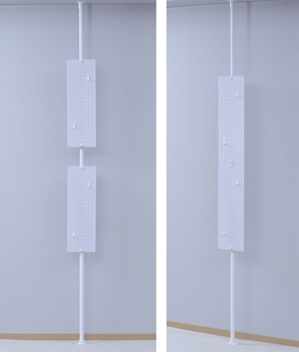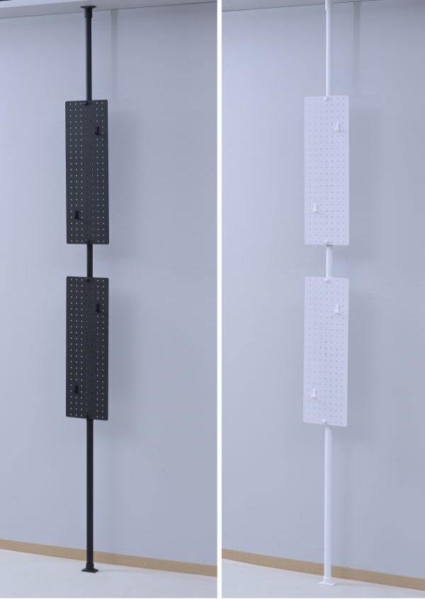 | 仕様 | ※畳などの柔らかい床面や強度の弱い天井へは設置ができません。 ※勾配天井は対応できません。 ●金属製の有孔ボード2枚が付いた、浮かせる収納棚 ●狭い玄関やリビングの隅など、奥行/隙間約7cmで省スペースに設置可能 ●高さ200-280cmに設置できる突っ張り固定式 ●工事用、工具も不要で組み立て可能 ●ネジ回しなど不要、グイッと力を入れて操作がシンプルな突っ張り装置 ●専用のフック4個付属 ●有孔ボード:穴径5mm、ピッチ25mm ●ボード外寸: 横20 縦60cm、2枚 ●フック耐荷重:パネル1枚あたり6kg、フック1個あたり0.5kg ●支柱が3分割式、部品を一部使わずに組み替えることで、高さ140-188cmの低い場所へも設置可能 ●天井、床の接地部は滑り止め付き(跡の付きにくいエラストマー素材使用) ●設置奥行: 7cm (床接地面サイズは4×6.5cmですが、本体中央伸縮パーツ部は奥行5.5cmあり、作業余白も含めて設置奥行7cm必要です。) |