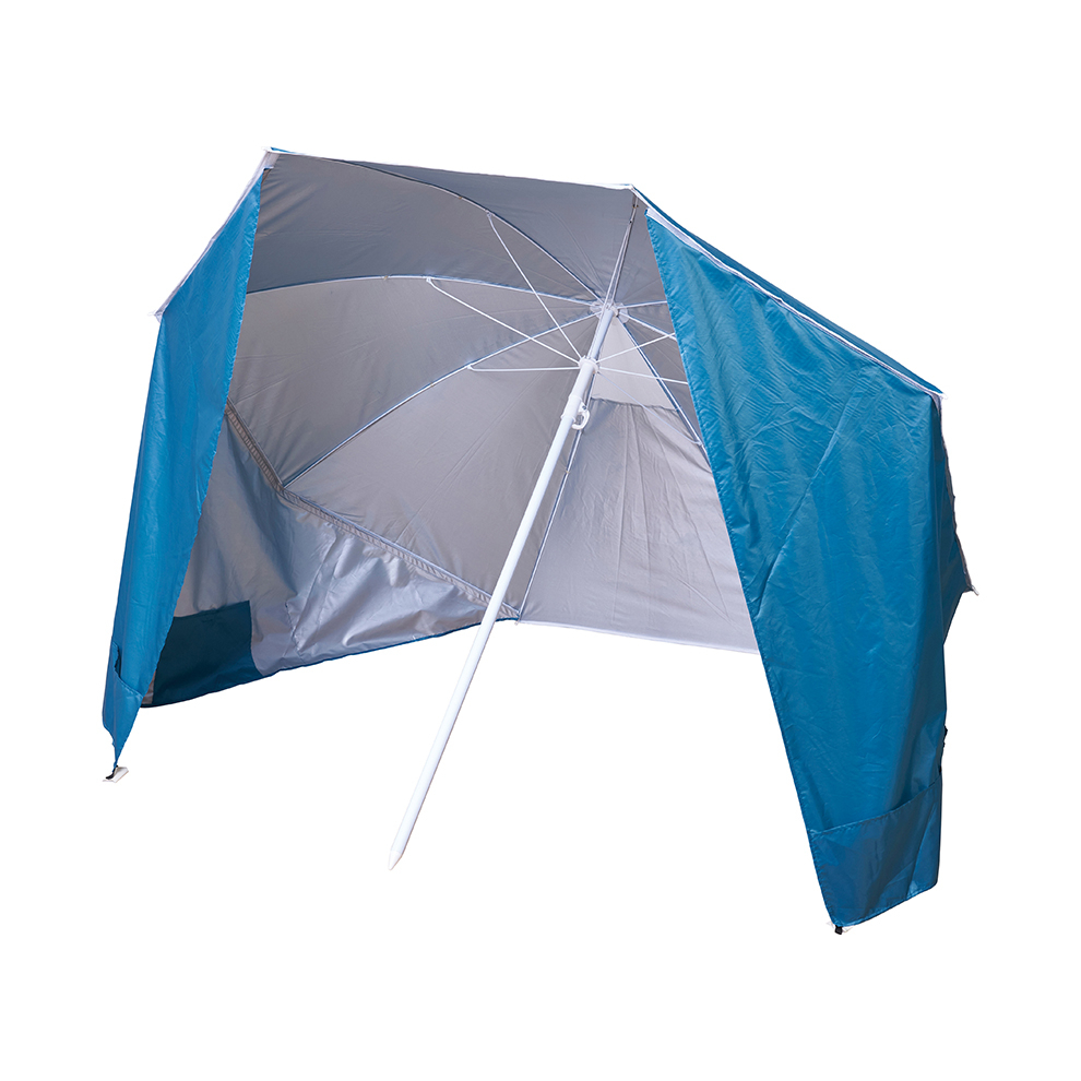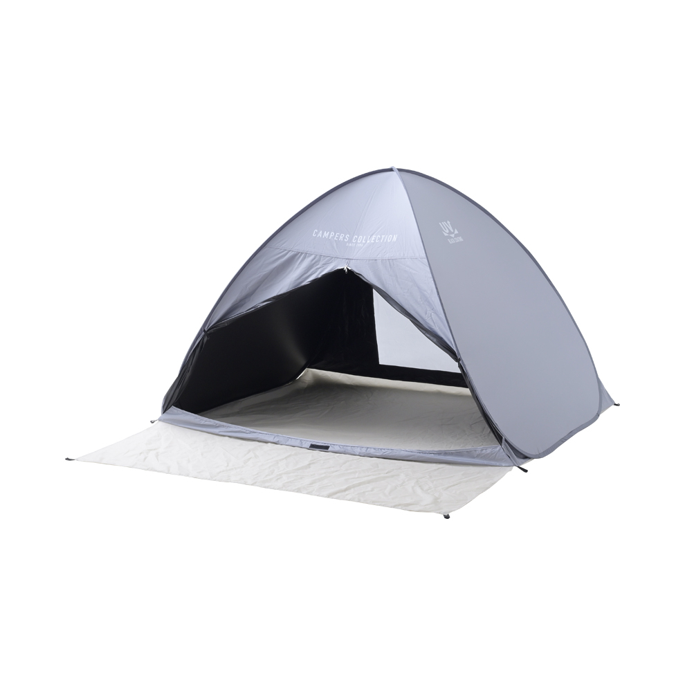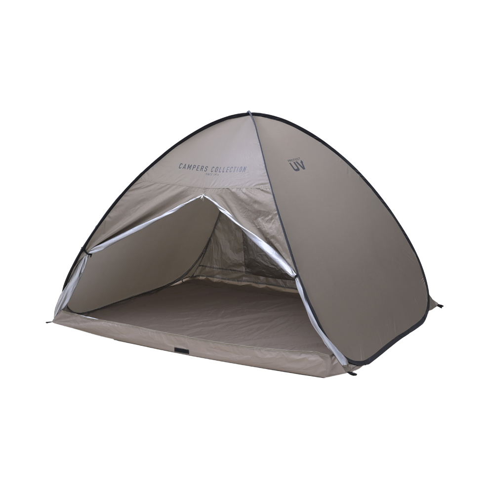 簡単に設営と撤収ができる!ワイド220cmの広々としたサンシェードです。風通りがよい全面メッシュ仕様。後面もフルオープンできるので前後で出入り可能です!
