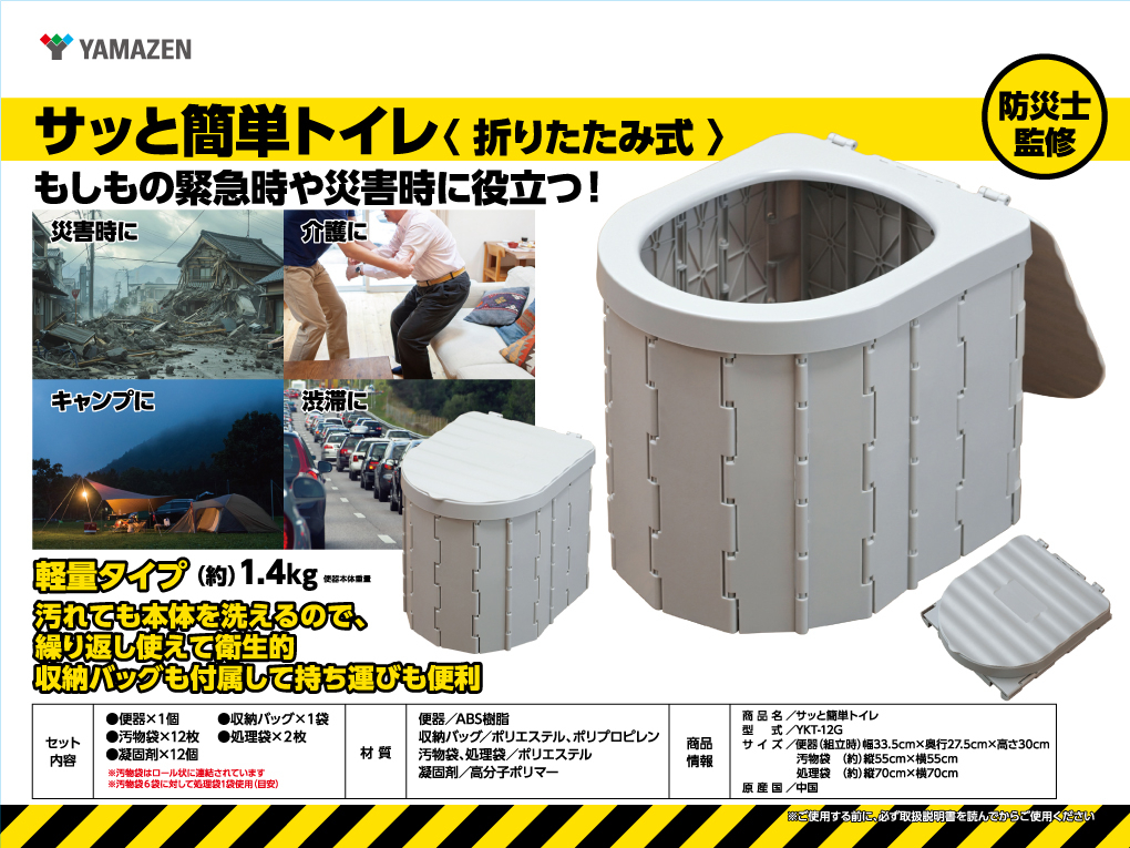 | 仕様 | ●セット内容:便器、収納バッグ、汚物袋×12枚、処理袋×2枚、凝固剤×12個 ●災害時に、介護に、キャンプに、渋滞に!困ったときに役に立つ ●汚れても本体を洗えるので繰り返し使えて衛生的 ●収納バッグ付きで持ち運びに便利 ●便器は折りたたみ式だから使わないときはコンパクトに収納が可能 |