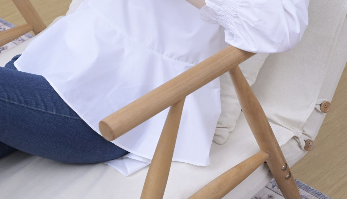 あたたかみのある、しっかりとした木製の肘掛が付いています。