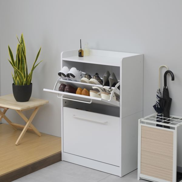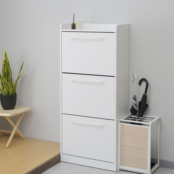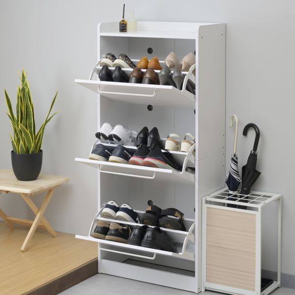 | 仕様 | ※重量のある商品ですので、お2人以上での組み立てをお願いいたします ●大きな靴もしまえるシューズラック ●奥行き30cmのスリムタイプ ●靴を見せずにすっきり収納できる ●フラップ式だから見やすく出しやすい ●1段に婦人靴で最大6足収納可能 ●2段タイプは12足、3段タイプは18足まで ●収納可能サイズ: 28cmまで ●扉を開いた時の奥行き: 53.5cm ●耐荷重: 天板10kg、引き出し1杯当たり5kg |