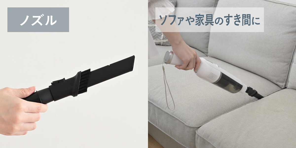 すき間ノズルとブラシノズルを切替えることができるため、ノズルを着脱する手間が省けます。ソファや家具のすき間、網戸のサッシなども快適にお掃除できます。