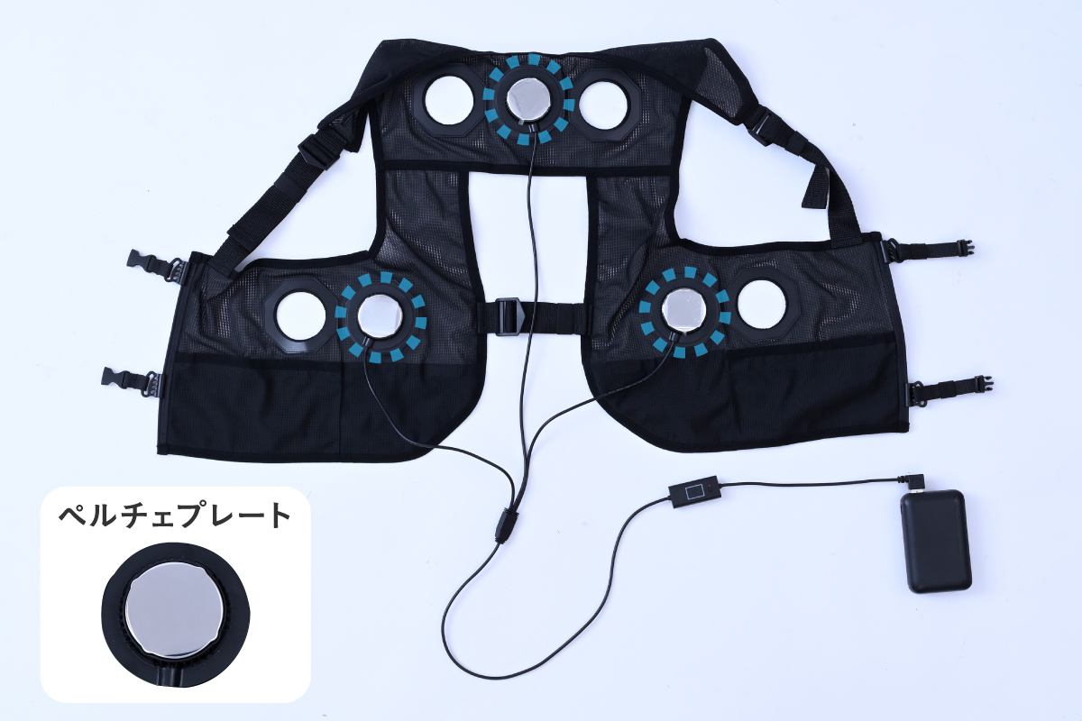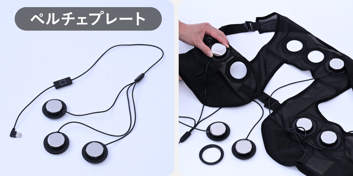 ベストの内側にペルチェプレートを取り付けることで、背中と脇を直接冷やします。