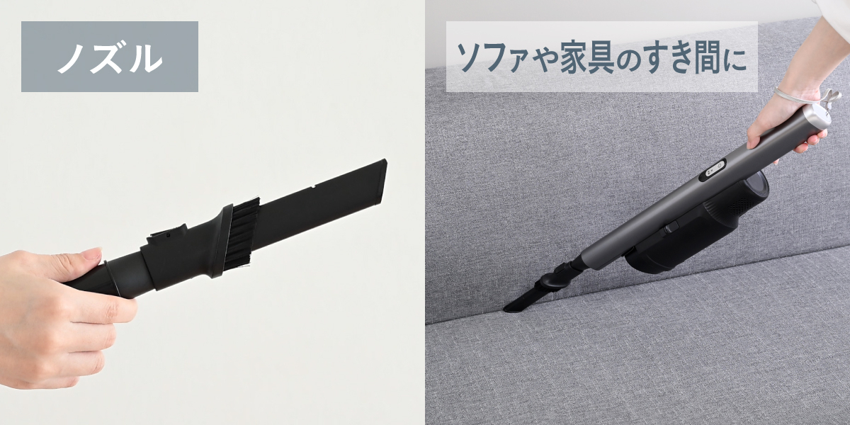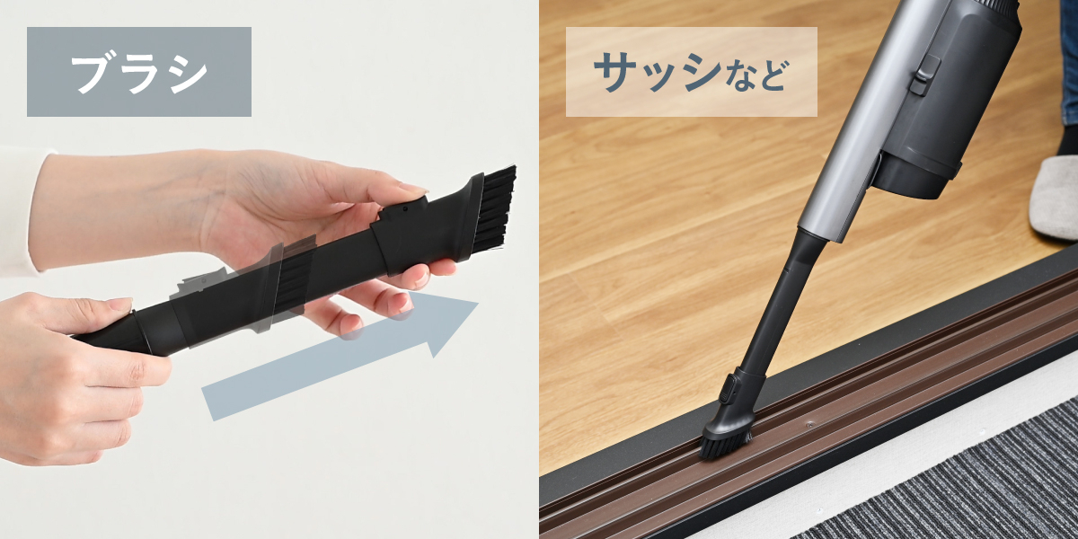 すき間ノズルとブラシノズルを切替えることができるため、ノズルを着脱する手間が省けます。ソファや家具のすき間、網戸のサッシなども快適にお掃除できます。