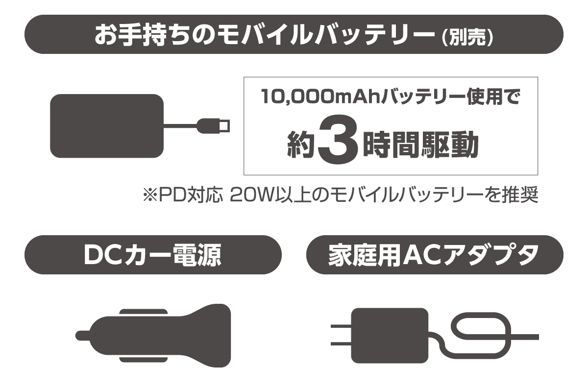 電源は、お手持ちのモバイルバッテリー、DCカー電源、家庭用ACアダプタに対応しています。