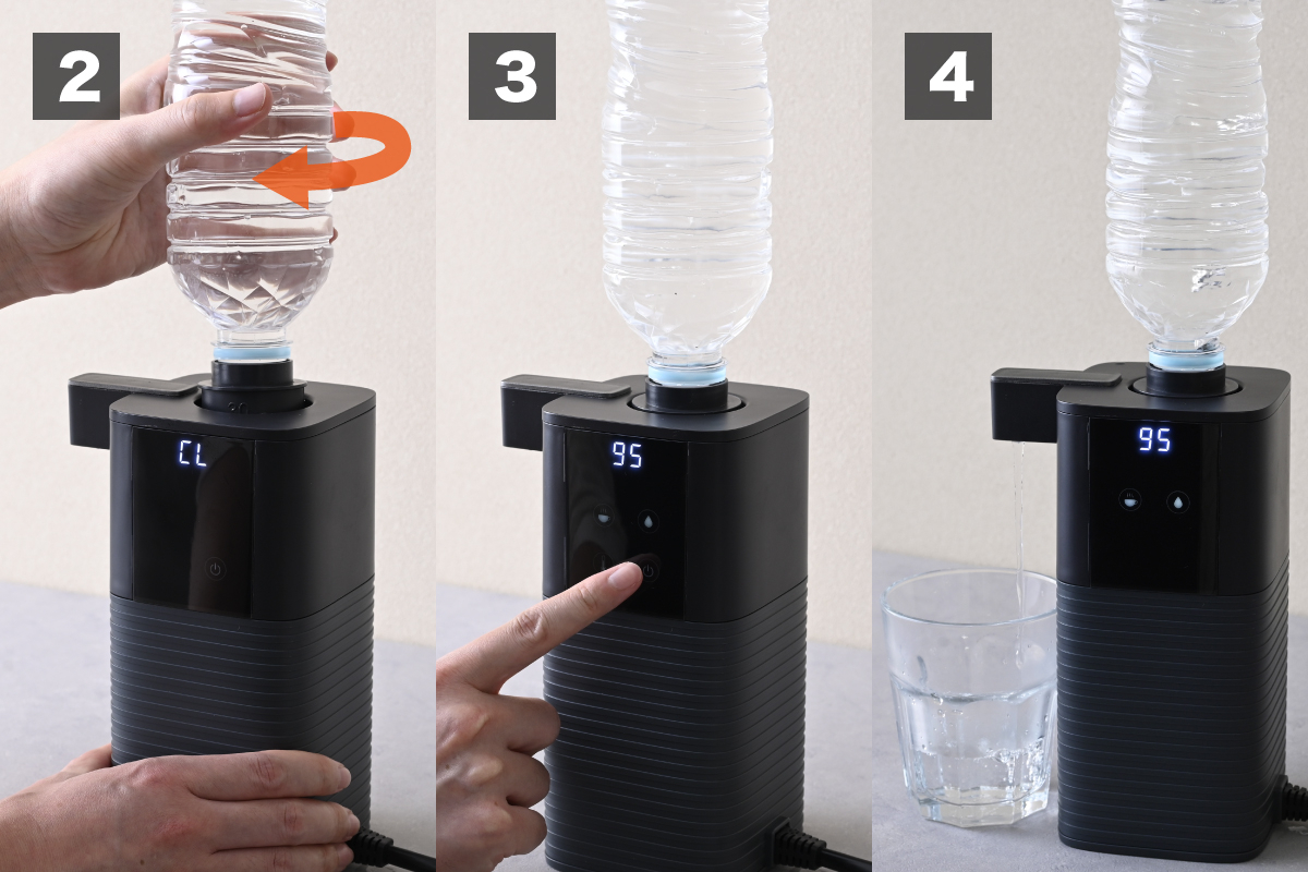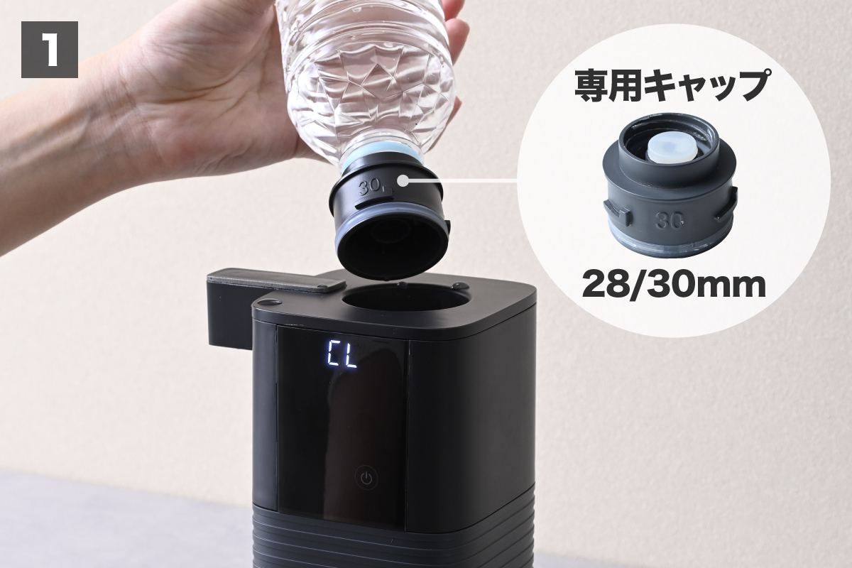 ペットボトルの口径に応じたアダプタキャップを取り付けます。本体上部のボトル差し込み口にペットボトルを差し込んで、タッチパネルで好みの温度と湯量を操作するだけ。